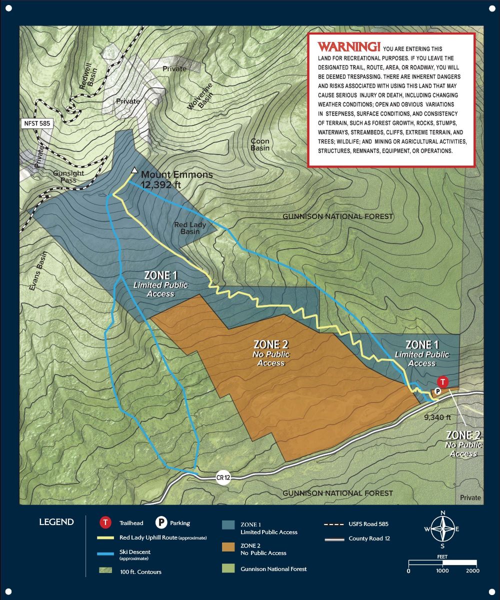 Winter recreation on Mt. Emmons is non-motorized. Please stay within designated public access areas, respect private property, and follow trailhead signage. Before heading out, check current avalanche conditions, travel prepared with safety gear, and remember there are no facilities on-site; pack out everything you bring in.